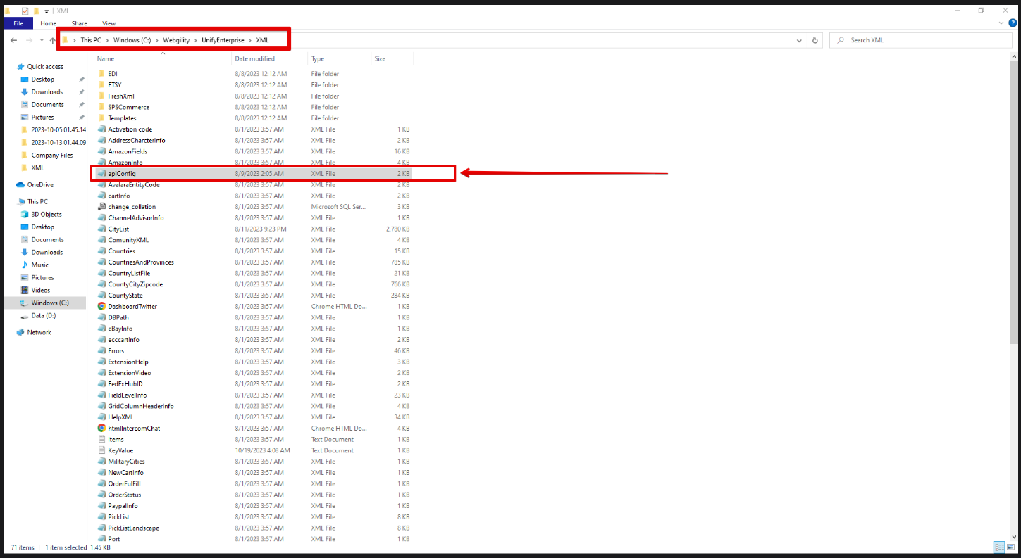 1). To view the instance name of the SQL database, go to C:\Webgility\UnifyEnterprise\XML. Here find the apiconfig and the instance name as shown in the screenshot below