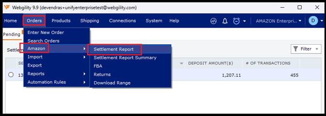 1. In Webgility Desktop, navigate to Orders then go to Amazon and click on Settlement Report​