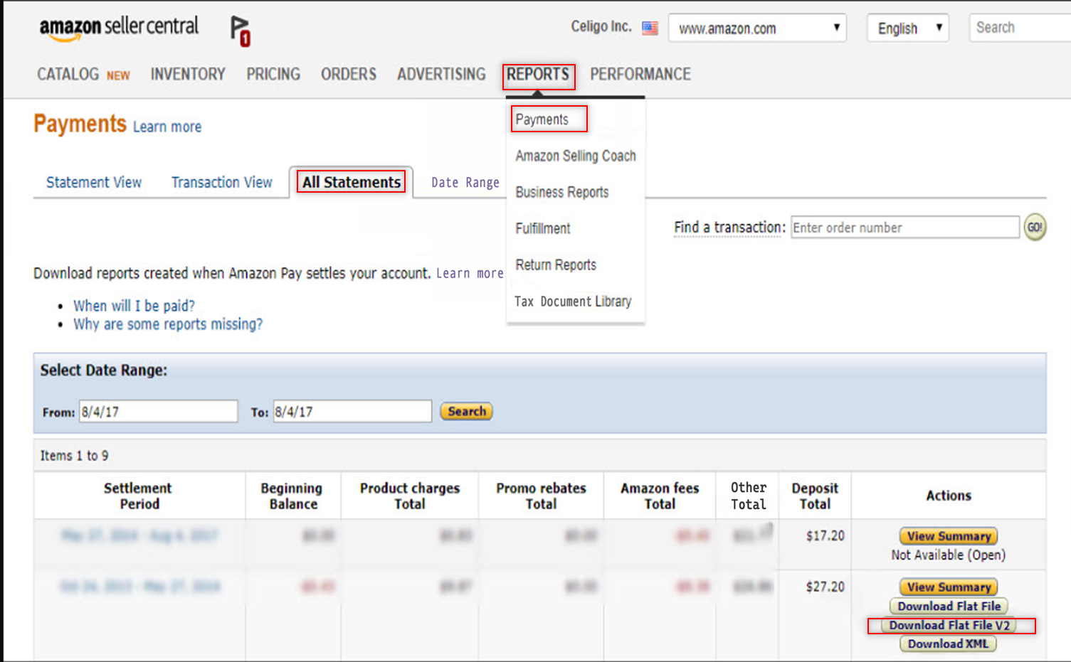 To manually import an Amazon settlement report, you will need to download it from the Amazon seller central account. The report should be downloaded in the Flat File V2 format. Here's how: