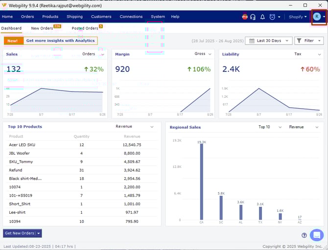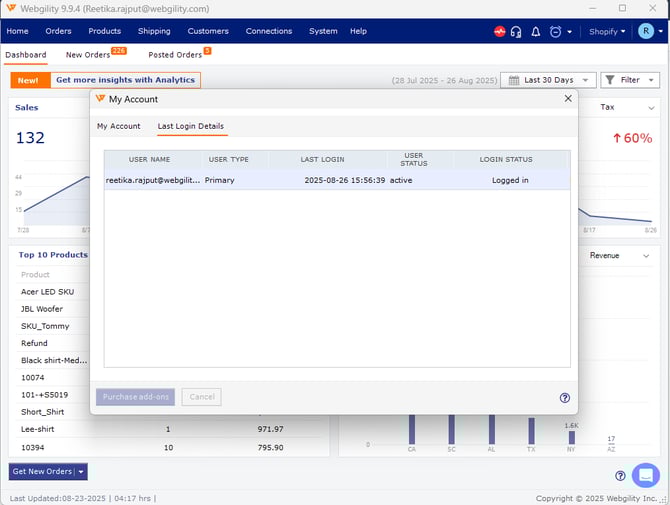 In order to check the Last Login Details, click on the initials of your name from the top right hand corner in the Webgility application. Select My Account.