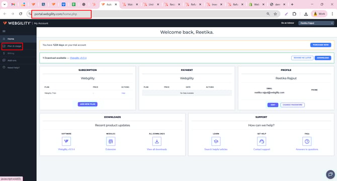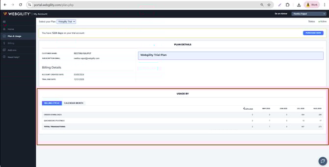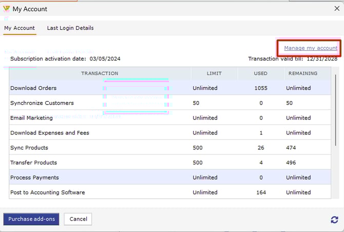 To check the usage activity, click on Manage My account and it will take you to portal.webgility.com