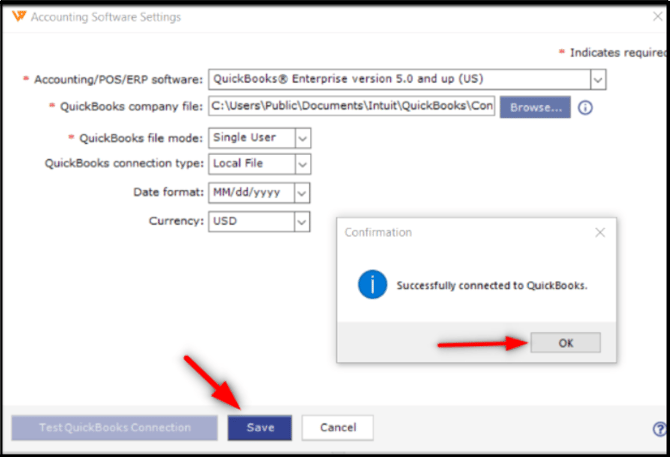 5. Once connected successfully, you will receive a message stating that you are successfully connected to QuickBooks. Click OK, then Save.