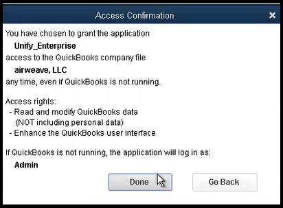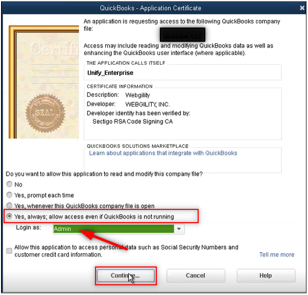 3. You’ll receive an Application Certificate popup in QuickBooks. Select Yes, always, and allow access even if QuickBooks isn’t running . Then select ‘ Admin ’ from the dropdown for ‘ Login as ’ and click Continue .