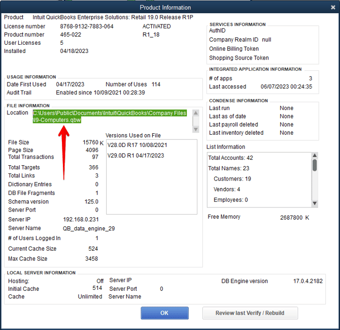 Look in the File Information section. This tells you where your company file is saved on your hard drive.