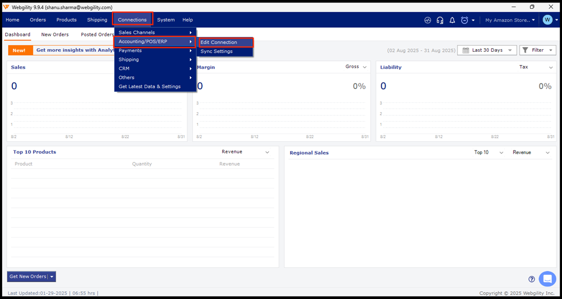 1. In Webgility Desktop, navigate to Connections > Accounting/POS/ERP> Edit Connection.