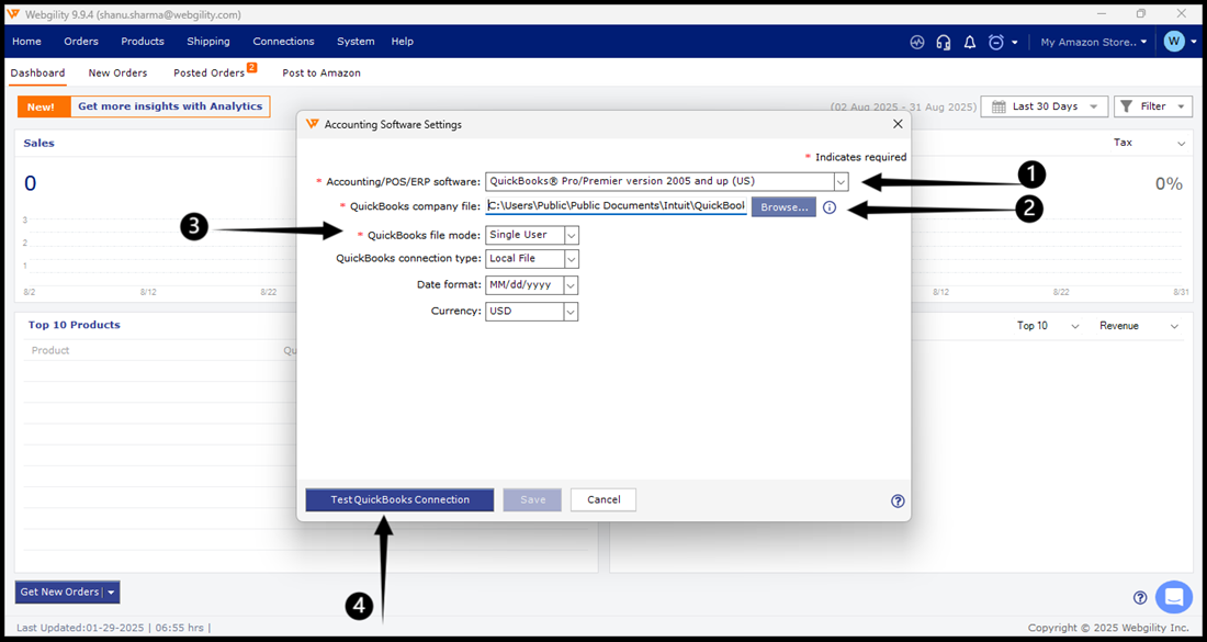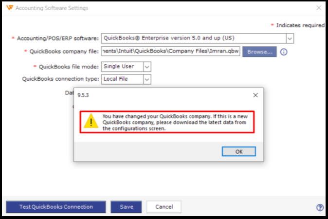 2. Select the correct Quickbooks version in the Accounting/POS/ERP software dropdown. Paste the QuickBooks file path that you copied earlier. Select Single user mode and click Test QuickBooks Connection.