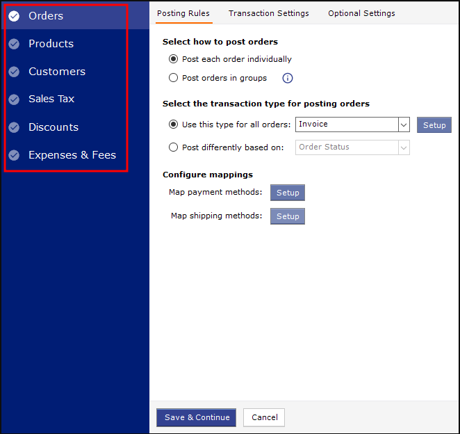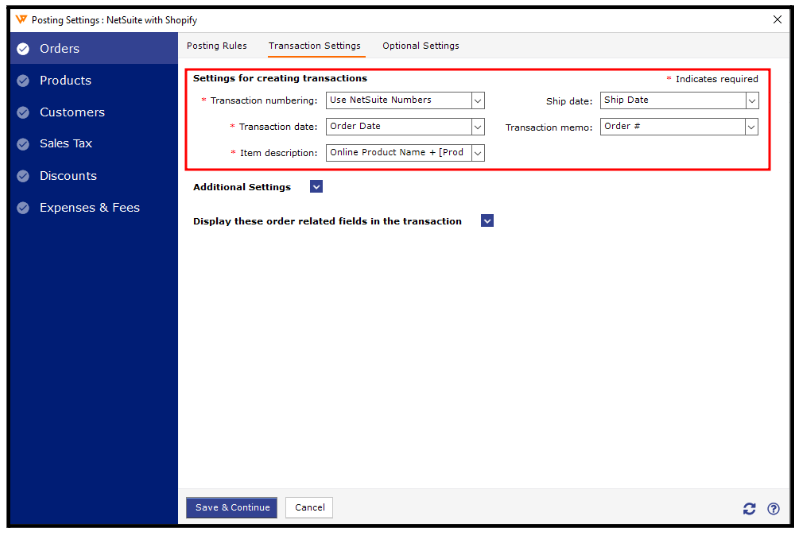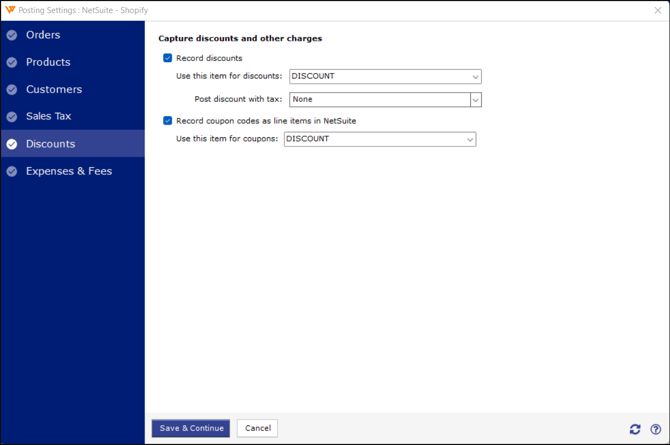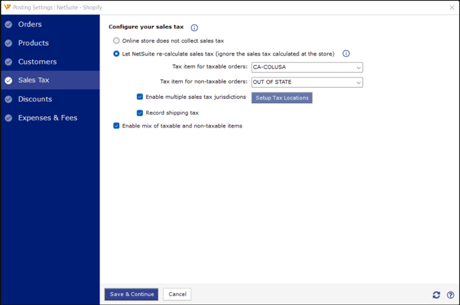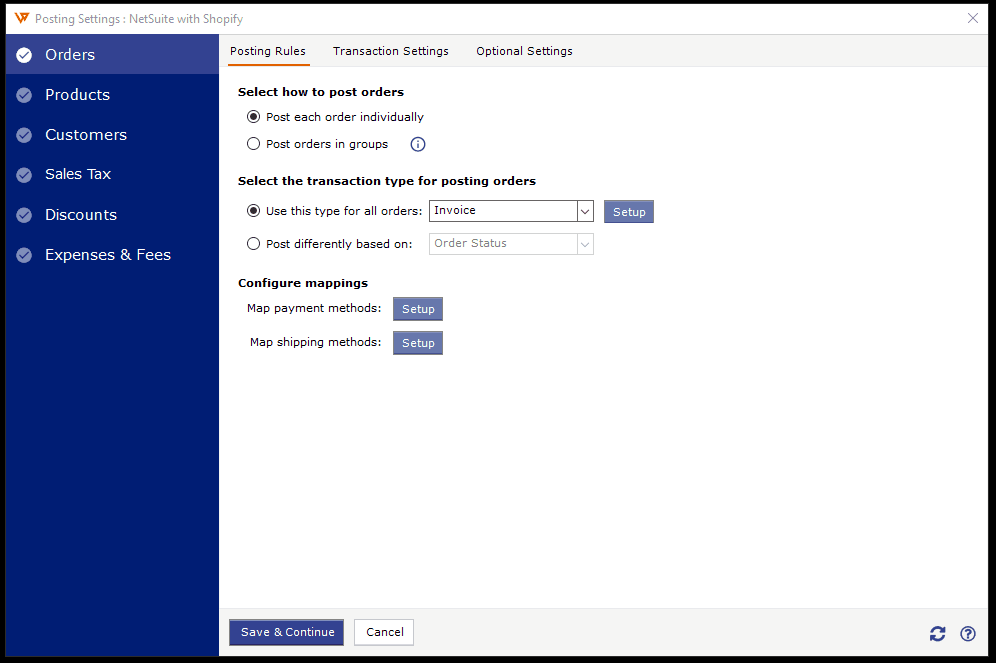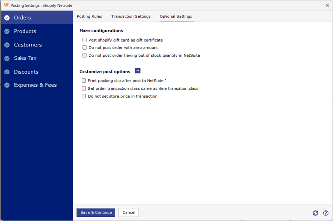 The Sync Settings screen lets you set how orders will be posted, including transaction details, products, customers, sales tax, discounts, and expenses/fees. You can customize each setting in detail to ensure all order information from the store is accurately recorded in NetSuite.