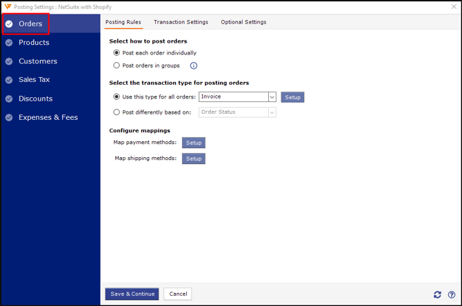 The Orders tab sets the transaction type as well as how the orders will be posted to NetSuite.