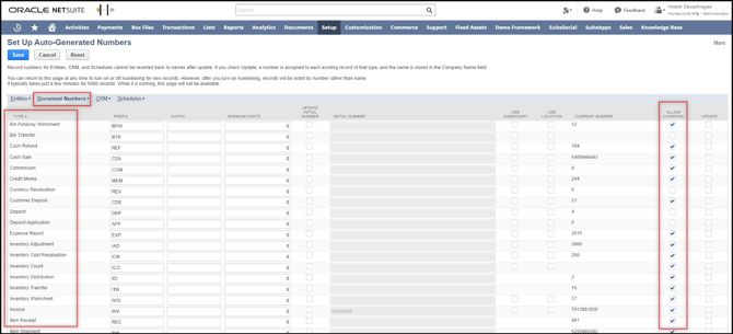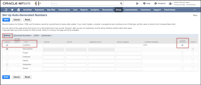 In NetSuite: Go to Setup > Company > Auto-Generated Numbers. Once you're on the auto-generated numbers page, you need to check "Allow Override" for the Customer under the Entities Tab. Then on the same page, go to the “Document Number tab†and check "Allow Override" for the transaction type you would select for the orders. Once done, click on Save on the upper left side of the page.