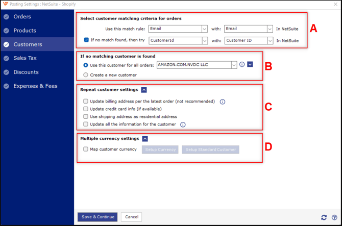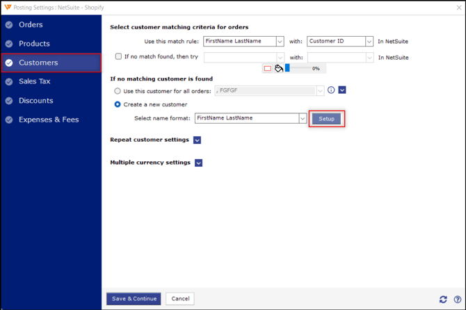 This section of the posting settings covers how Webgility Desktop will behave if a customer is a returning customer or a brand new customer in NetSuite.