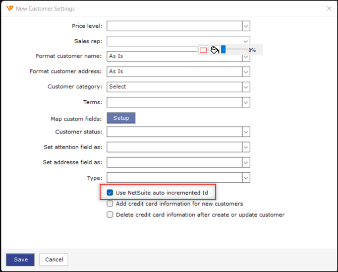 You may also enable the option Use Netsuite Auto Incremented ID in WD customer settings. In Webgility Desktop, Go to Connection > Accounting > Sync Settings. Now on the posting settings window, go to the Customer section and click on the Setup (image below). On the Setup window, check the box Use Netsuite Auto Increment ID.
