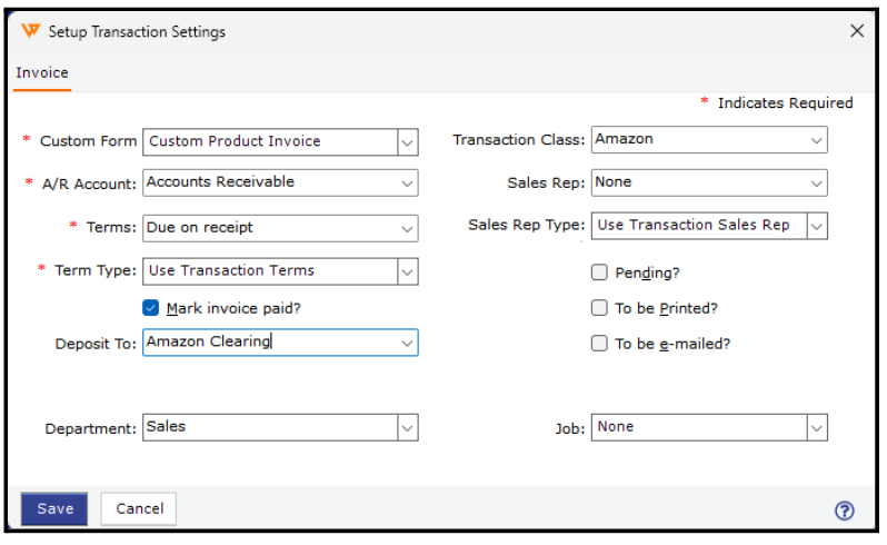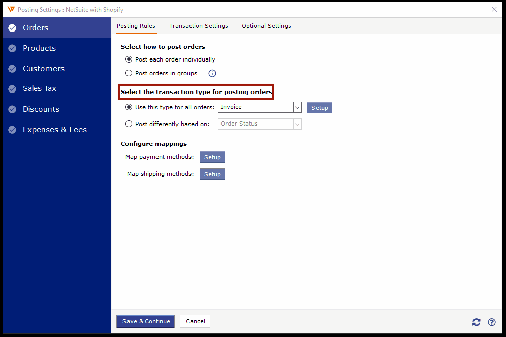 2. Select the transaction type for posting orders: Here you can choose Cash Sales, Invoice, or Sales Order. We recommend selecting Invoice.