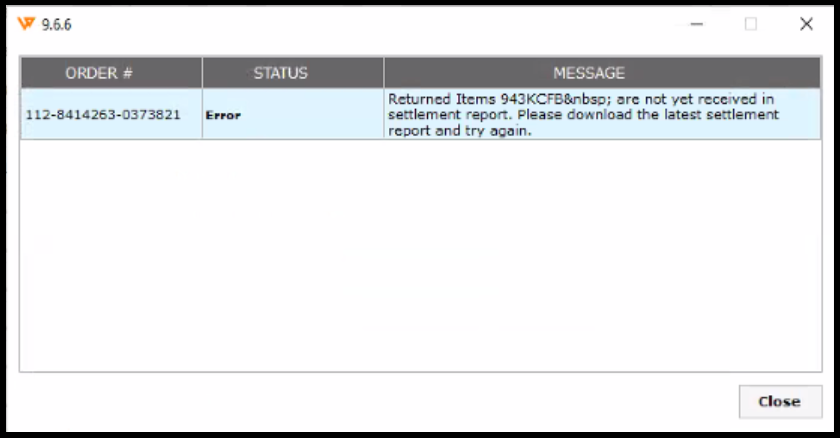 Returned Items; have not yet received in the settlement report. Please download the latest settlement report and try again