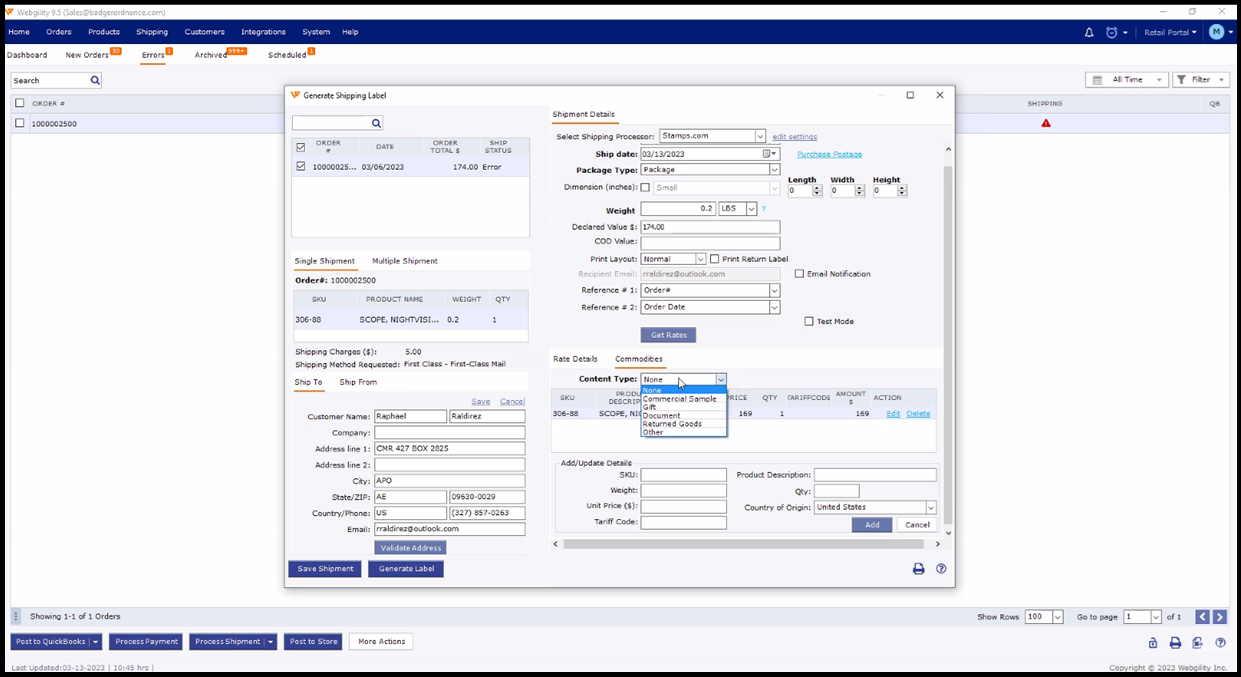 1). When processing the shipment, on the shipping screen, select the appropriate Content Type under the Commodities tab.