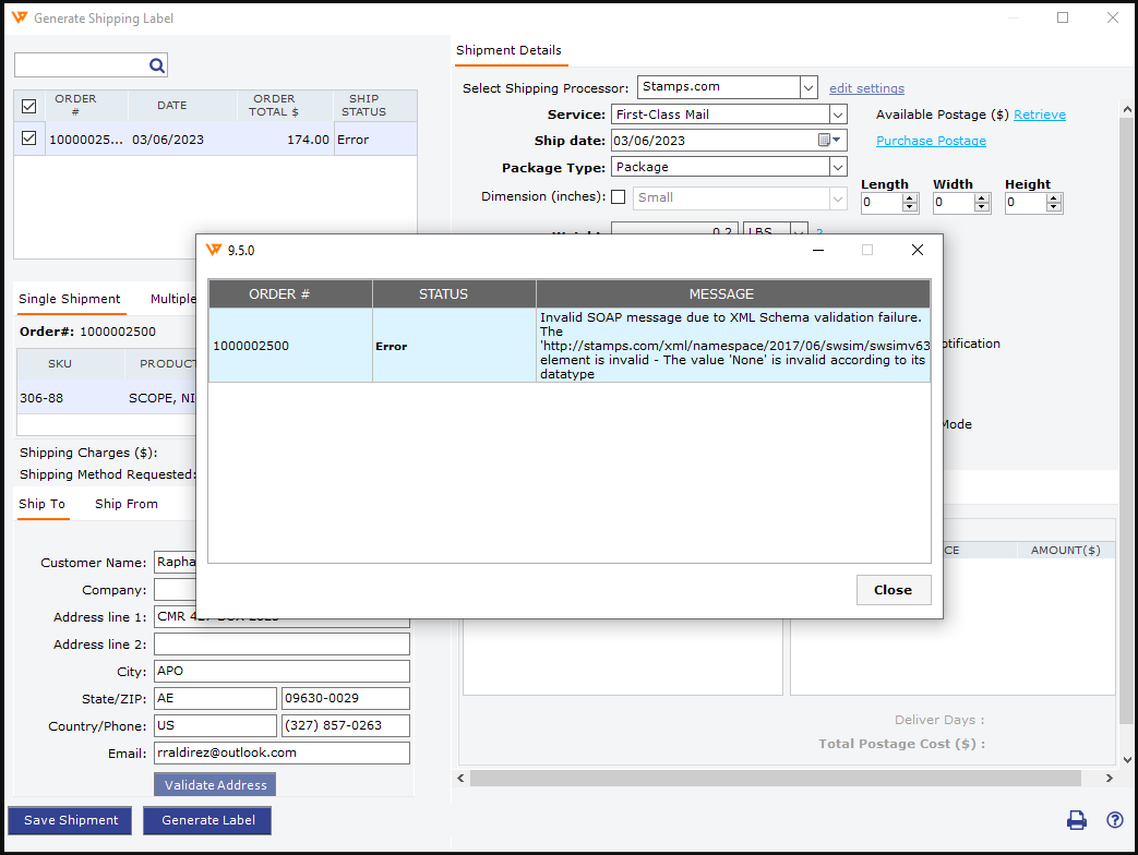 This article helps Webgility Desktop users in resolving the “Invalid SOAP message due to XML schema validation failure, content type element is invalid – the value 'None' is invalid according to its data type†error encountered while processing shipments in Webgility Desktop. It explains the reason behind this error, which typically occurs when the content type is missing under the Commodities tab during shipment processing.