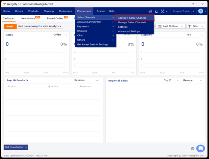 If this is your first sales channel in Webgility Desktop, you’ll see a prompt to Add New Sales channel after logging in.