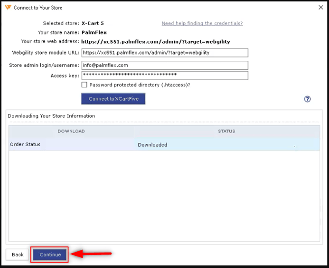 Click Connect to X-Cart 5. Once connected, select Continue at the bottom left of the screen.