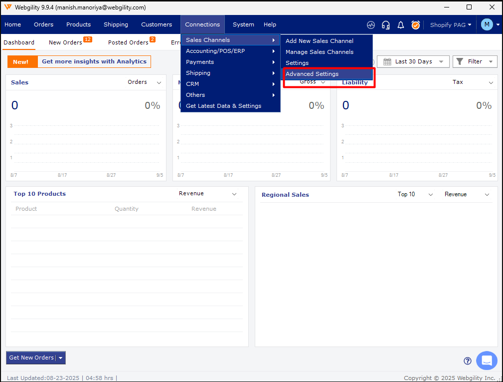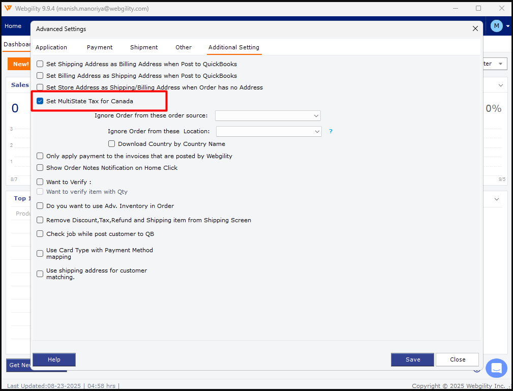 1). To enable the Webgility Desktop application to show Canadian states in the sales tax configuration, please navigate to Connections > Sales channels > Advanced settings> Additional Settings