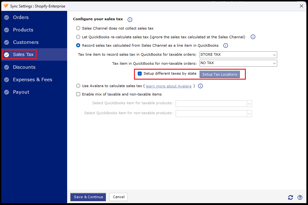 3). Now that the option is enabled, please navigate to the sales tax setup in Webgility Desktop under Connections > Accounting/POS/ERP> Sync Settings> Sales Tax.
