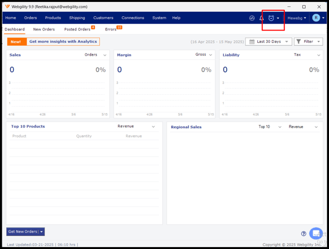 Once logged in, you'll find the Scheduler Indicator button located in the upper right corner, next to the sales channel selection drop-down.