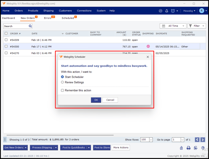 The Scheduler includes a feature called the "Scheduled View," which serves as a temporary holding area. The orders will be downloaded from your sales channel to this queue automatically and will be posted automatically. Follow the steps in this helpful article on an overview on Scheduler Settings: Scheduled View in Webgility Desktop
