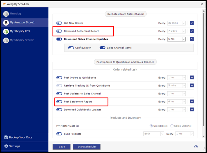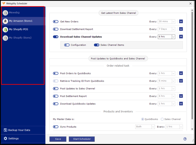Similar to the Webgility Desktop application, the scheduler configuration window has a section for selecting a specific sales channel and configuring each in its own specific manner.