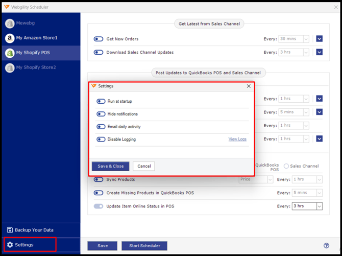 - Settings: You can control popup notifications for Scheduler processes here—consider hiding them due to frequent alerts. For Scheduler activity, review C:\Webgility\UnifyEnterprise\SchedulerLog. Additionally, customize app behavior, including startup launch and email reports for Scheduler data.