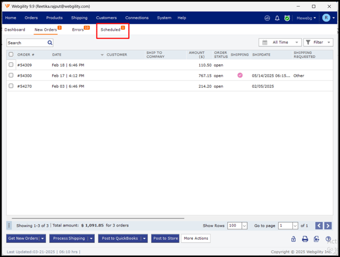 Note: When consolidated posting is enabled, there is no Scheduled view. Orders will remain in the "New Orders" tab and will be posted from there.