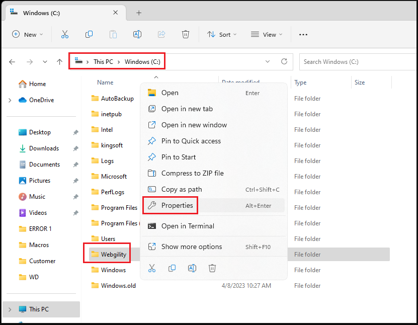 1). Navigate to the installation directory folder for Webgility Desktop, which is typically located at "C:\Webgility" on your computer.