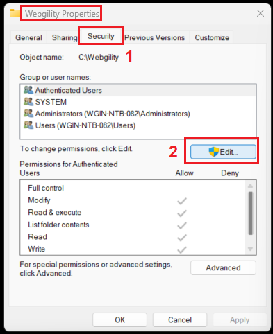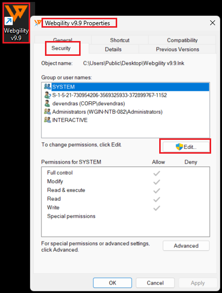 3). In the Properties popup, go to the Security tab and click on the Edit button.