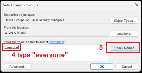 4). Click on Add, type in "everyone", and click on Check Names to verify that it's recognized.