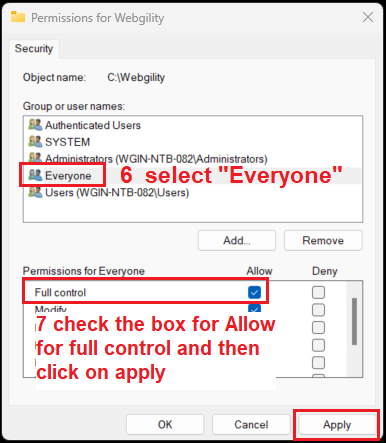 5). Click on OK, select "everyone" user, and grant Full control access.