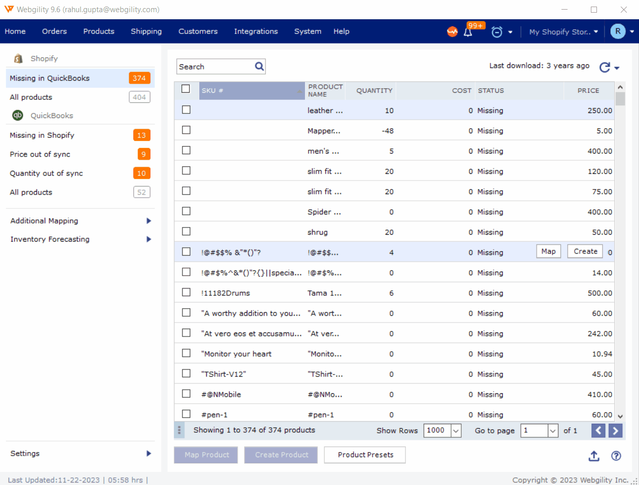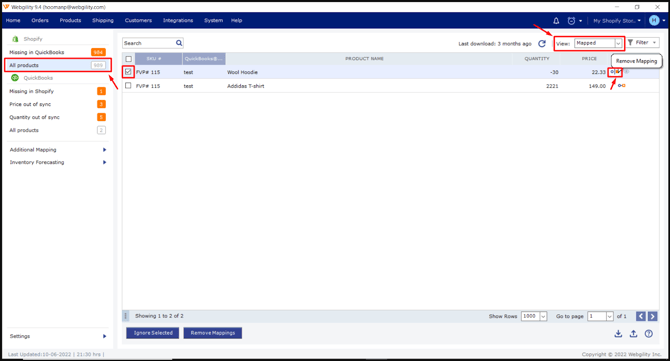 First, ensure products are downloaded in Webgility from both the sales channel and QuickBooks.