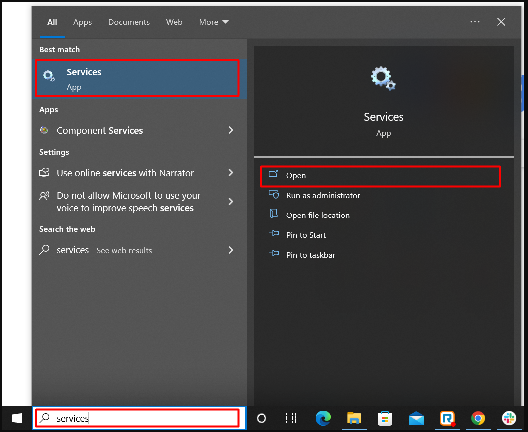 1). From the Windows search bar, search for Services, click Open or hit Enter on your keyboard.
