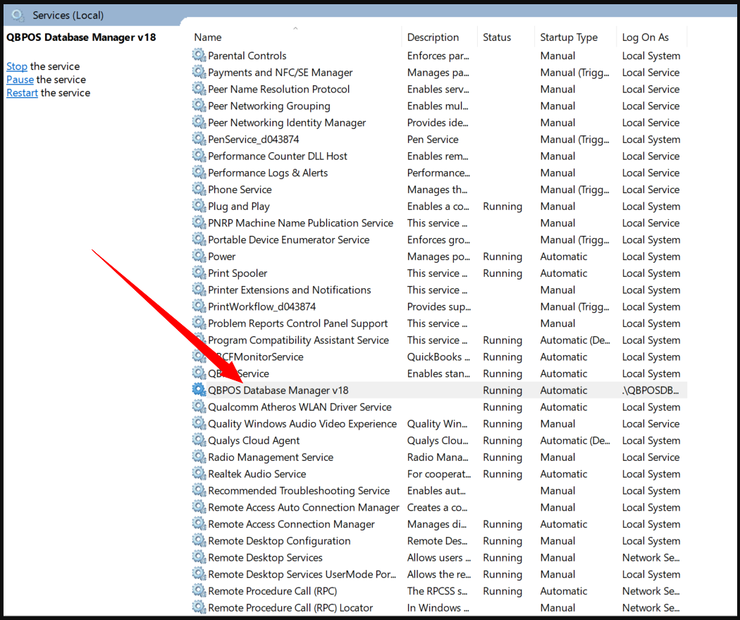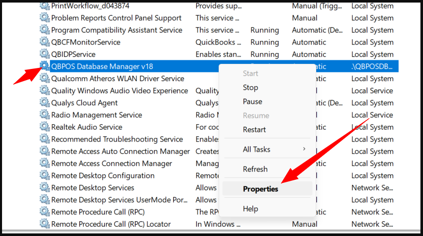 2). On the Services Window, look for QBPOS Database Manager, right-click the QBPOS Database Manager and click Properties.