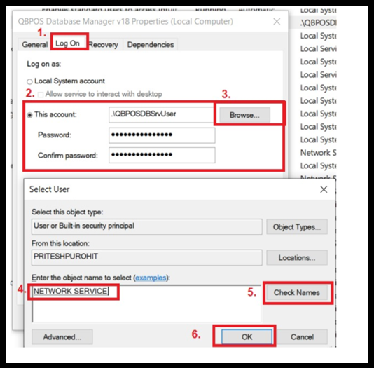 3). Click the second tab, Log On & select This Account, click Browse & under the object name, type Network, click Check Names, select Network Service, click OK, remove "Password and Confirm Password†click Apply & OK.