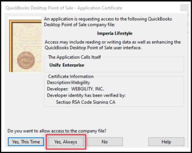 5). Now, in Webgility Desktop, navigate to Connections> Accounting/POS/ERP > Edit Connection & Test QuickBooks Connection. You’ll get a prompt in QuickBooks POS, click Yes, Always & grant access permission.