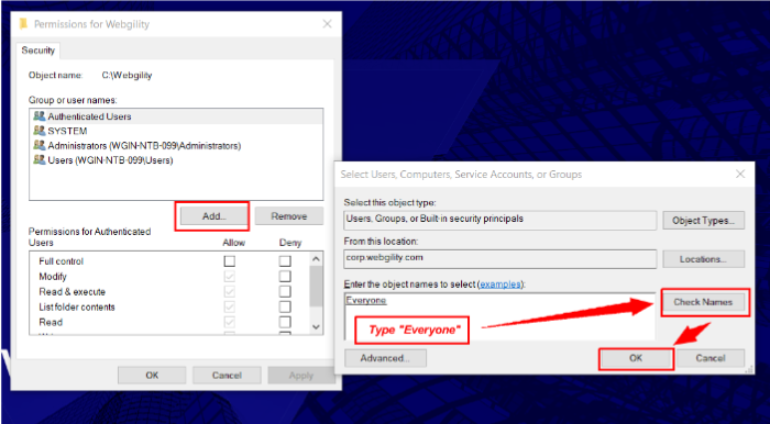 6. Under the "Object Name" field, type in "Everyone" and then click "Check Names".