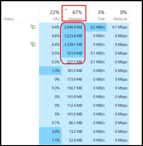 2. In the Task Manager window, check the memory usage of other applications. To ensure optimal performance, the usage should be between 70% and 80% for Webgility Desktop to operate smoothly.