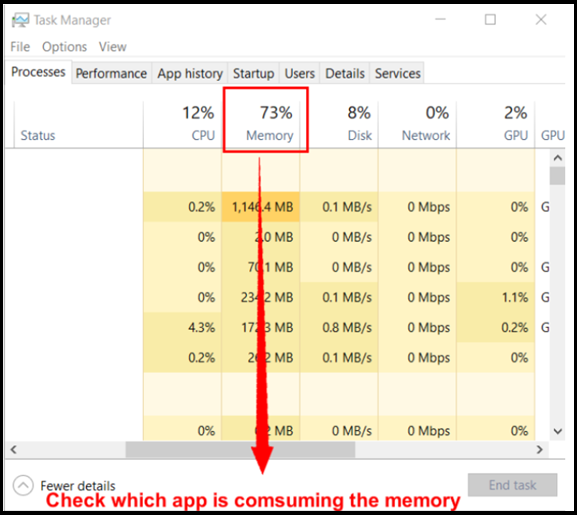 3. In the Task Manager window, check the memory usage of other applications. To ensure optimal performance, the usage should be between 70% and 80% for Webgility Desktop to operate smoothly.