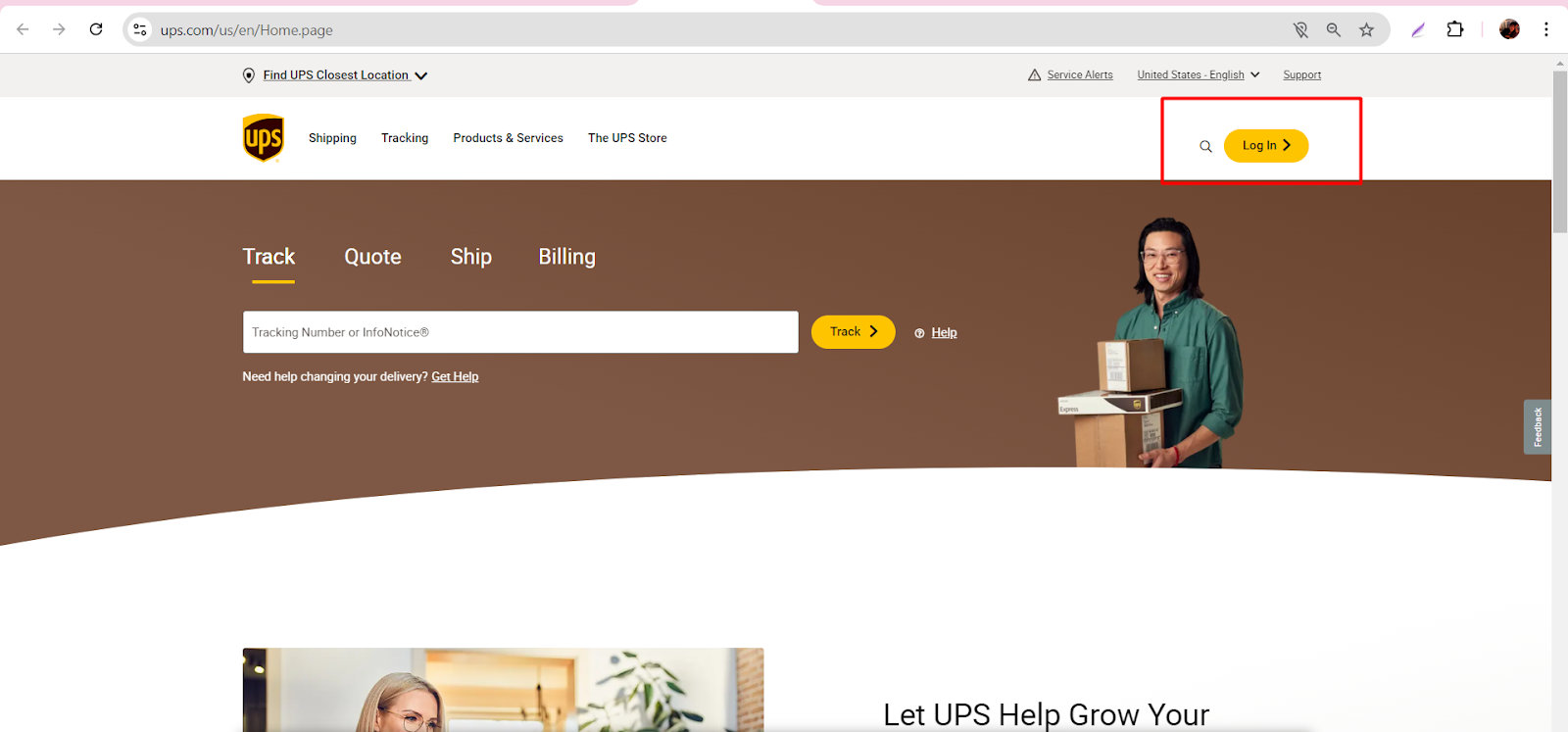 Visit www.ups.com and click the "Login" button in the top-right corner of the screen. Enter your login credentials, including your user ID and password, and click "Log In" to access your account.