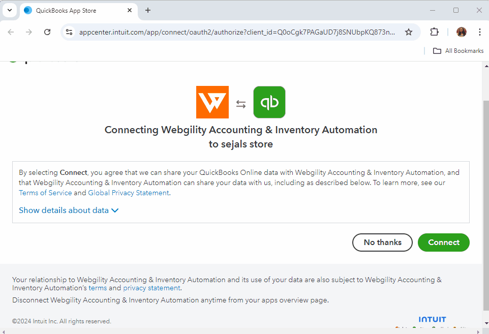 Note: If a QuickBooks Online online account is already logged in on your browser and you want to connect to a different account then first log out of that account from the browser.