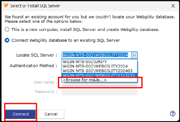 3). Choose "Connect Webgility database to an existing SQL Server." From the "Locate SQL Server" dropdown, select "Browse for More" and allow 2-3 minutes for the software to identify all SQL Server database instances on the local network.