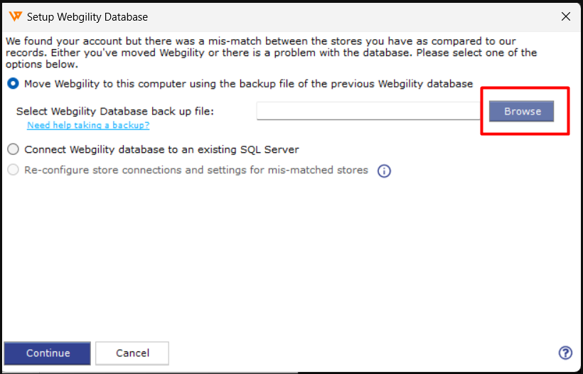 5). You will be redirected to a window to restore a database. Browse for the most recent database backup (use the one from the old server) and continue with the restoration.