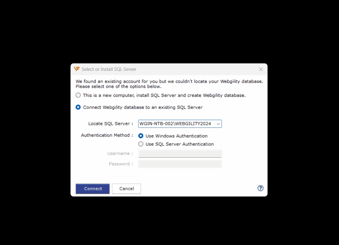2). Launch the Webgility Desktop Software. It will attempt to connect to an existing server but will ultimately display a database configuration form.