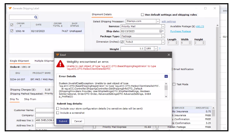 Unable to cast object type “wg.eCC.DTO.baseShippingRegistration†to type “wg.eCC.DTO.FedexClientDetailsDTOâ€