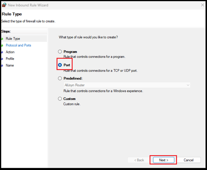 Choose Port and click Next.