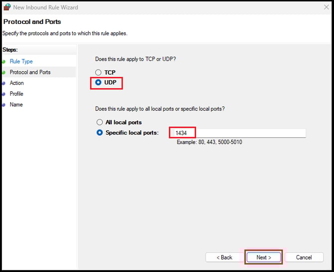 Select UDP and enter 1434 in the Specific Local Ports field, then click Next.
