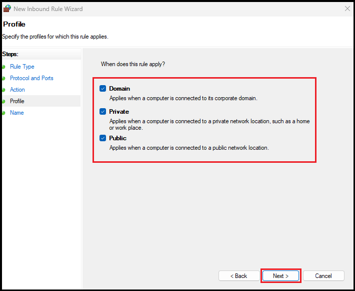Select all three profiles: Domain, Private, and Public, then click Next.