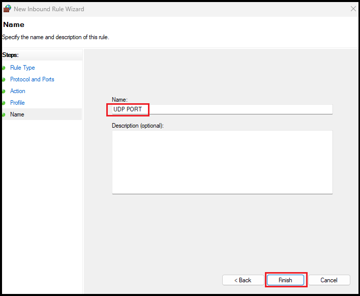 Name the rule UDP PORT, then click Finish. In Inbound Rules, select New Rule.